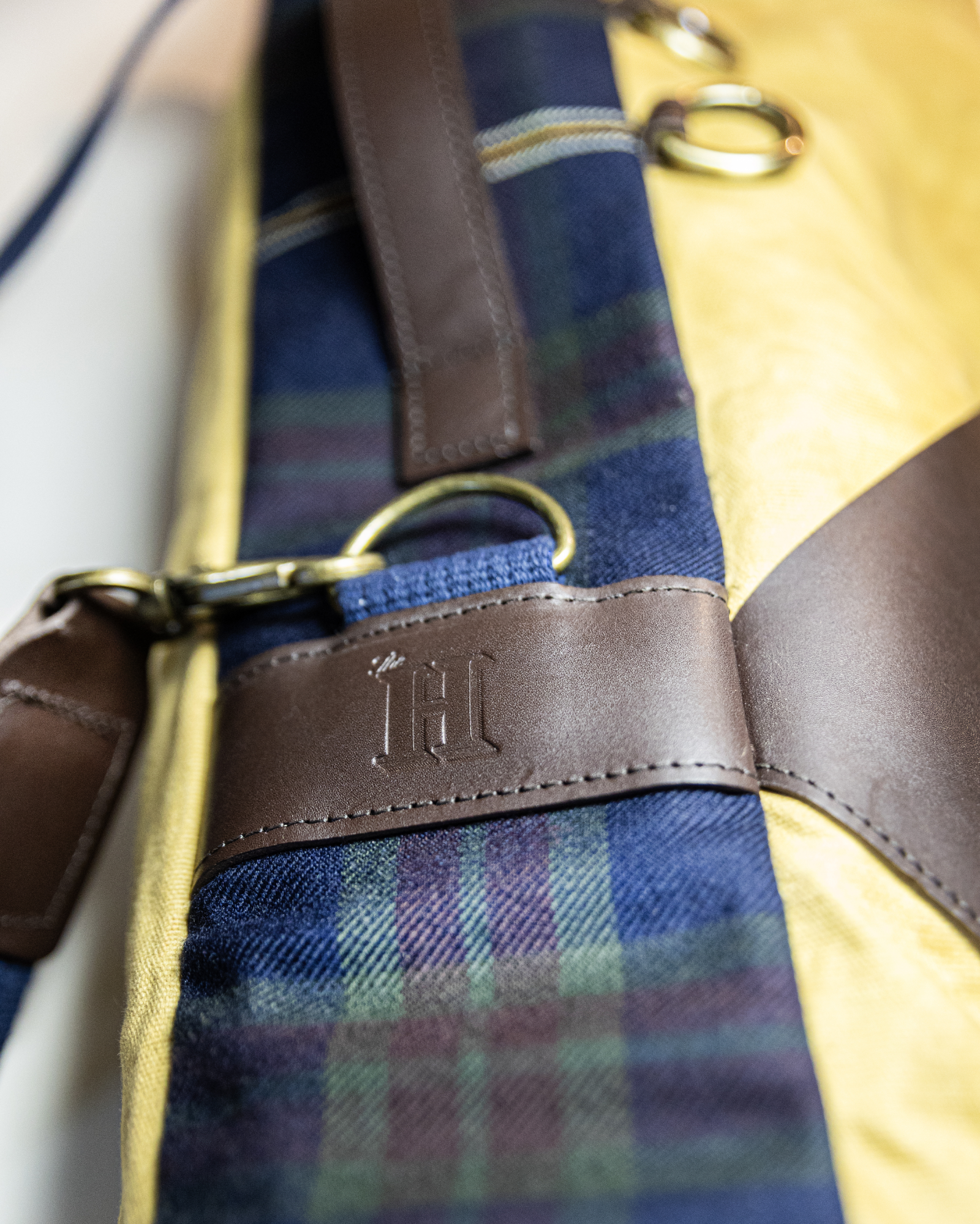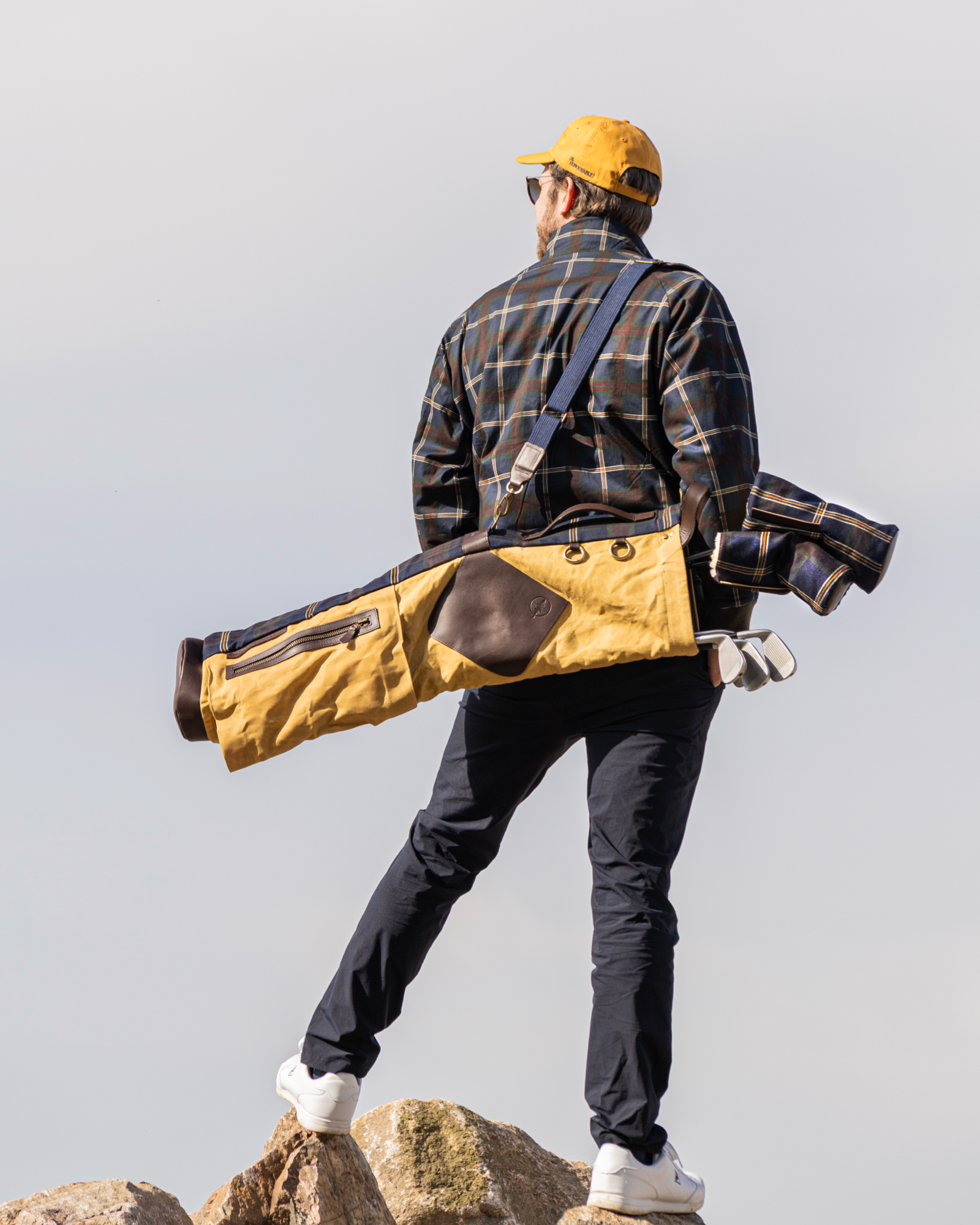 A truly unique collaboration has led to a limited edition of only five bags in this combination. Featuring The Honourable's own tartan made by Loch Carron, Scotland on the spine, a coffee colored leather from Tuscany, Italy and a soft yellow waxed cotton canvas will make you look incredible on the course - especially together with The Honourable's new collection with the same tartan.