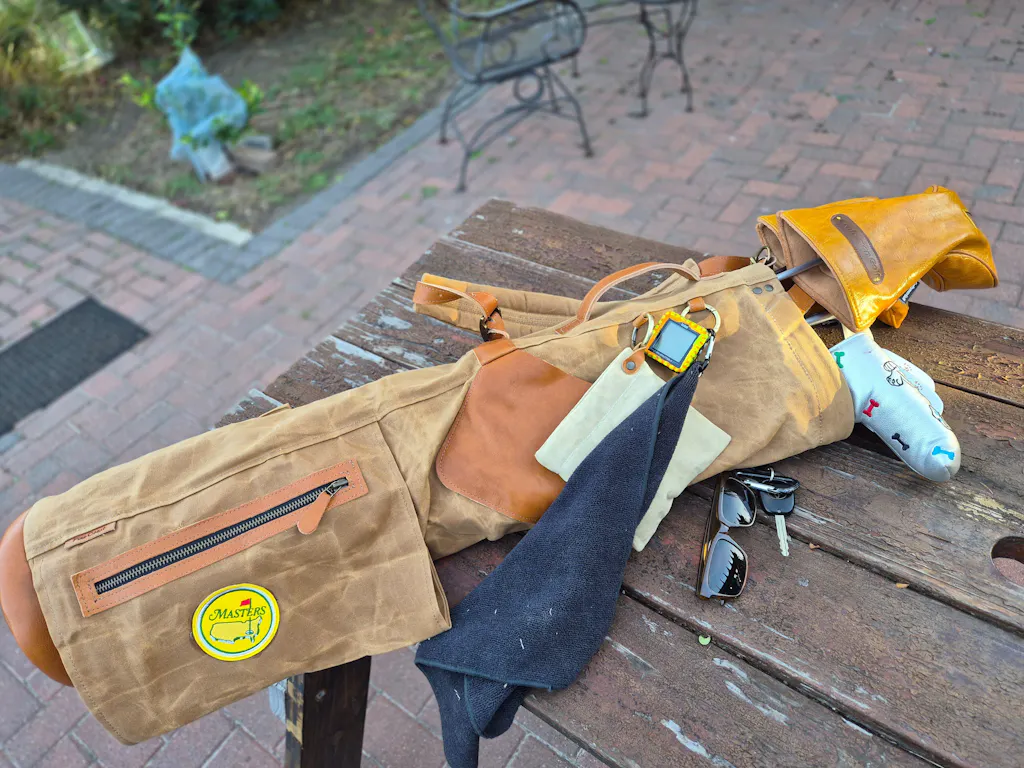 The bag has multiple functional pockets, including a zippered one for your valuables, an open pocket which is ideal for your bottle. The bag also features a yardage book pocket along with two sturdy leather loops placed so you can hang your range finder, towel, brush, speaker or what you need for your round. All of our bags, pouches and headcovers are made by hand.